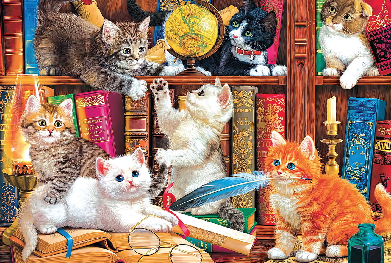 Adorable and playful kittens exploring a cozy library make up this charming 300-piece jigsaw puzzle. Perfect for cat lovers and puzzle enthusiasts alike.